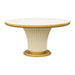 Transform your dining space with the luminous beauty of the Scotts Square Round Dining Table. The circular top showcases a stunning vanilla onyx-look surface, elegantly bordered by a sumptuous gold trim that enhances its graceful silhouette. A sculptural pedestal base, adorned with flowing reeded details reminiscent of grand architectural columns, adds a sense of artistry and refinement. Designed to create an intimate yet elevated dining experience, this exquisite table comfortably accommodates up to six guests.